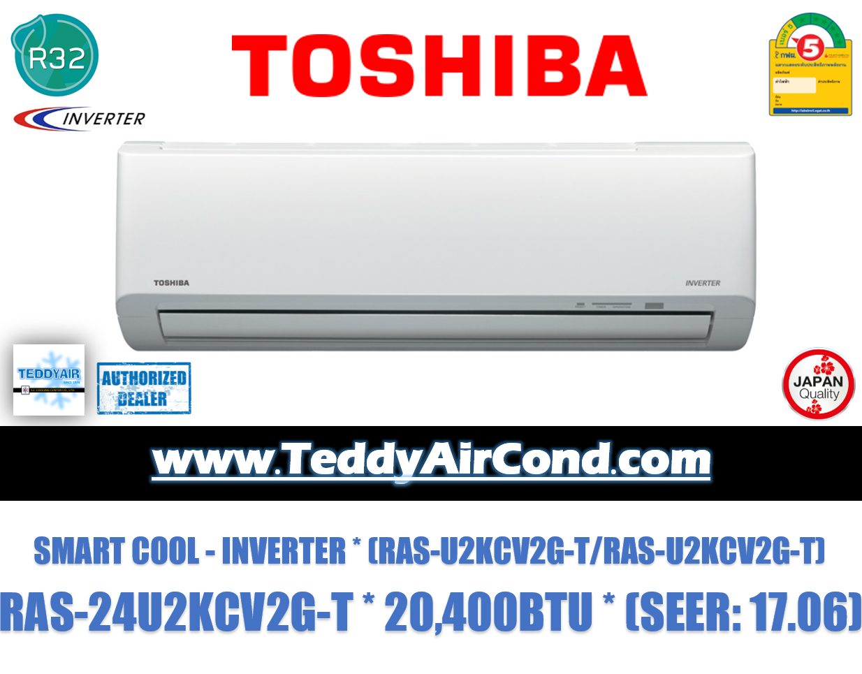 TOSHIBA รุ่น RAS24U2KCV2/RAS-24U2ACV2นี้เป็นระบบอินเวอร์เตอร์ ด้วยเทคโนโลยีที่ช่วยประหยัดพลังงาน เย็นสบายและเย็นเร็วทันใจ โดยช่วยปรับเปลี่ยนความเร็วในการทำงานของคอมเพรสเซอร์ให้มีความยืดหยุ่นสูง เพื่อรักษาอุณหภูมิที่ตั้งไว้ ช่วยให้คุณประหยัดไฟได้มากขึ้นด้วยมาตรฐานฉลากประหยัดไฟเบอร์ 5 ที่สำคัญทำงานเงียบ ไร้เสียงรบกวนเวลานอนหลับพักผ่อนของคุณ โดยใช้เสียงเพียง 23 เดซิเบลเท่านั้น เคลือบแผงคอยล์ด้วย Aqua Resin Coated  ลดการจับตัวของคราบสกปรกและฝุ่นละออง ไม่ให้เข้าไปเกาะตัวและสะสมที่แผงคอยล์ได้ง่าย ช่วยป้องกันการเกิดเชื้อราและกลิ่นอับในแอร์ พร้อมทั้งช่วยลดปัญหามากมายที่จะเกิดขึ้นตามมาได้อีกด้วย มีระบบAutomatic Self-Cleaning ทำความสะอาดตัวเองด้วยพัดลมที่ทำงานต่อเนื่อง 20 นาทีหลังปิดเครื่อง เพื่อไล่ความชื้นบนแผงคอยล์ ทำให้มั่นใจได้ว่าอากาศที่ปล่อยออกมาสะอาดและปลอดภัยอย่างแน่นอนค่ะ  ส่วนแผงคอยล์ทำจากวัสดุทองแดง (Copper Coil) ซึ่งทนทานต่อการผุกร่อน มีSwing & Fix Louver ที่ช่วยปรับทิศทางองศาของลมได้ถึง 10 ระดับ หรืออาจเลือกใช้แบบ Auto-Swingก็ได้  มั่นใจด้วย Japan Quality ที่กล้ารับประกันยาวนานถึง 10 ปี และชิ้นส่วนอุปกรณ์ทุกชิ้นยาวนาน 5 ปี