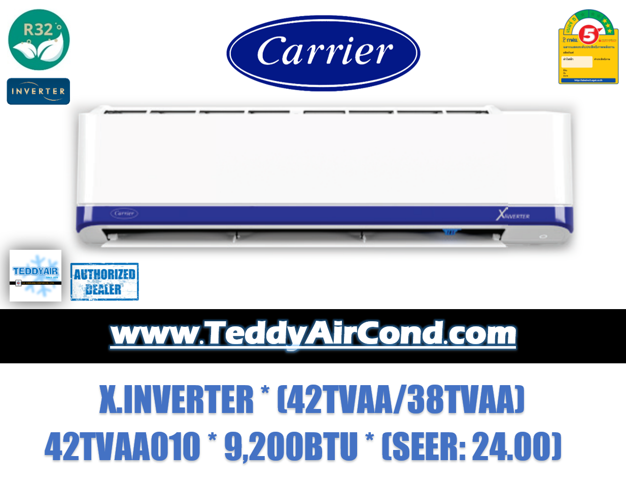 แอร์ 21000 BTU ยี่ห้อ CARRIER X Inverter รุ่น 42TVAA010 เป็นแอร์แบบติดผนัง  มั่นใจด้วยมาตรฐานประหยัดพลังงานเบอร์ 5 สูงสุด 3 ดาวช่วยประหยัดไฟกว่าอินเวอร์เตอร์ทั่วไปถึง 33% โดยผ่านการรับรองจากการไฟฟ้าฝ่ายผลิตแห่งประเทศไทย มั่นใจในพลังความเย็นที่สะอาดสดชื่นด้วยโปรแกรม X – IONIZER พลังฟอกอากาศที่เหนือกว่า ช่วยกรองฝุ่นขนาดจิ๋วอย่าง PM 2.5และเชื้อโรครวมถึงกลิ่นไม่พึงประสงค์ต่างๆได้ดีเยี่ยมการันตีด้วยการรับรองจากสถาบันต่างๆ ที่ได้มาตรฐาน  มีแผ่นฟอกอากาศชนิดพิเศษ Static Cottonช่วยกำจัดฝุ่น PM 2.5 ได้ถึง 94% พร้อมเคลือบสารLeuconostoc Enzyme ซึ่งลดการเกิดแบคทีเรีย และไวรัสได้ด้วย มีระบบ ANTI – SHOCK ที่ช่วยป้องกันแผงวงจรไฟฟ้าได้ดีเยี่ยมในกรณีแรงดันไฟตกหรือเกิน มีระบบSELF CLEANING ท่สามารถทำความสะอาดตัวเองได้โดยอัตโนมัติ โดยชุดพัดลมจะปล่อยลมไล่ความชื้นที่คอยล์เย็นเพื่อลดการสะสมของเชื้อโรคและสิ่งสกปรก ที่ตัวคอยล์เย็นเคลือบสาร “อควา เรซิ่น” (AQUA RESIN)ช่วยลดการสะสมของสิ่งสกปรกที่ผิวคอยล์ได้มากกว่าเดิมทำให้อากศสดชื่นอยู่เสมอ