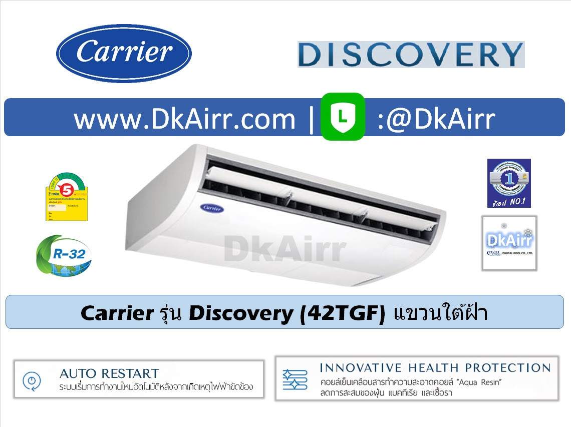 CARRIER รุ่น DISCOVERY 38TSF0301A1/42TSF0301CP เป็นแอร์แขวนใต้ฝ้า ที่ทรงพลังความเย็น สามารถทำความเย็นได้สูงสุดในทุกตารางนิ้วของพื้นที่ ช่วยให้คุณประหยัดไฟ และให้ความรู้สึกผ่อนคลาย ทำงานเงียบโดยระดับเสียงต่ำสุดอยู่ที่ 32-35 เดซิเบล มีระบบPowerful Cooling ที่สามารถกระจายลมได้กว้างและไกล มีPower Saving ประหยัดไฟสูงสุดเบอร์ 5 สุดล้ำด้วยModern Design ดีไซน์ล้ำสมัย สวยงาม เหมาะกับทุกสไตล์การตกแต่ง และInnovative Health Protection เคลือบสารทำความสะอาดคอยล์ “Aqua Resin” ลดการสะสมของฝุ่น แบคทีเรีย และเชื้อรา รับประกันคอมเพรสเซอร์ 5 ปี รับประกันอะไหล่ 1 ปี