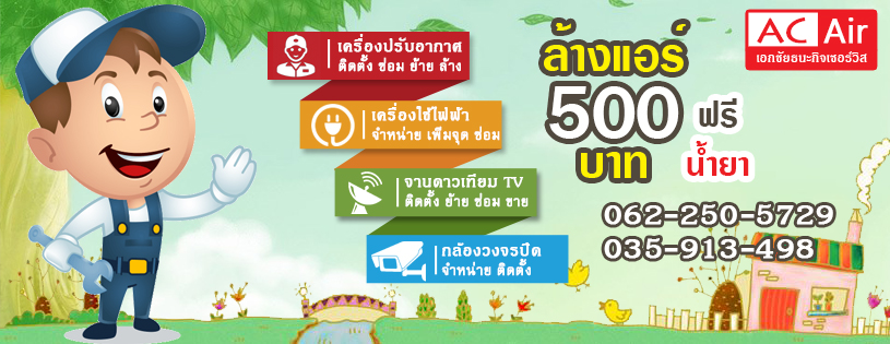 ล้างแอร์เพียง 400 บาทเท่านั้น(เติมน้ำยาฟรี) บริการ รับล้างแอร์รังสิต ล้างแอร์ลำลูกกา ล้างแอร์ธัญบุรี ล้างแอร์คลองหลวง พร้อมบริการติดตั้ง ย้าย ซ่อม แอร์ ที่นี่มีแอร์จำหน่ายทุกยี่ห้อ จำหน่ายติดตั้ง ฟรีอุปกรณ์เสริม สมาคมแอร์แอนด์เซอร์วิส ล้างแอร์รังสิต ล้างแอร์ธัญบุรี ล้างแอร์ลําลูกกา ล้างแอร์คลองหลวง ราคาถูก รับซ่อมแอร์ แอร์เสีย, แอร์ไม่เย็น, เติมน้ำยาแอร์, แอร์เป็นน้ำแข็ง, แอร์รั่ว, น้ำหยด-น้ำรั่ว, เบรคเกอร์ตัด, แอร์มีกลิ่น, น้ำยาแอร์ขาด, มอเตอร์ไม่หมุน, ฟ้าผ่าแล้วแอร์ดับ, รีโมทยิงไม่ติด, เซ็นเซอร์ไม่รับสัญญาณ, คอมไหม้ และอาการอื่นๆ
